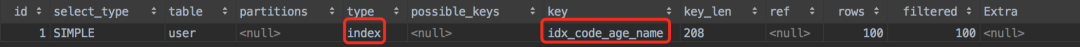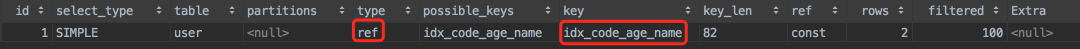 code是联合索引的第一个字段,在where中使用了,而age是联合索引的第二个字段,在order by中接着使用。
